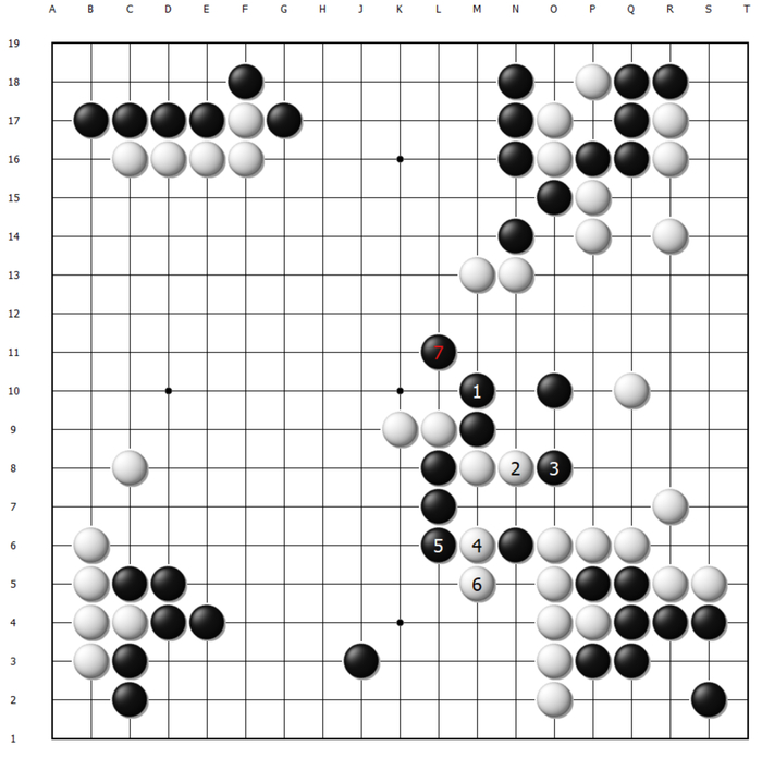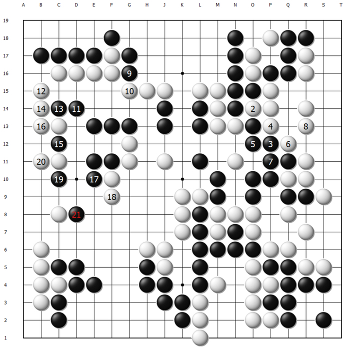 这样白棋顺势将一串先手交换,黑棋大龙岌岌可危。至130手,黑棋最后的机会同样是在O13扳出,可以说这盘棋失利的根本原因之二是申真谞始终忽略了O13扳出后的后续手段,以及给白棋制造麻烦的严厉程度。