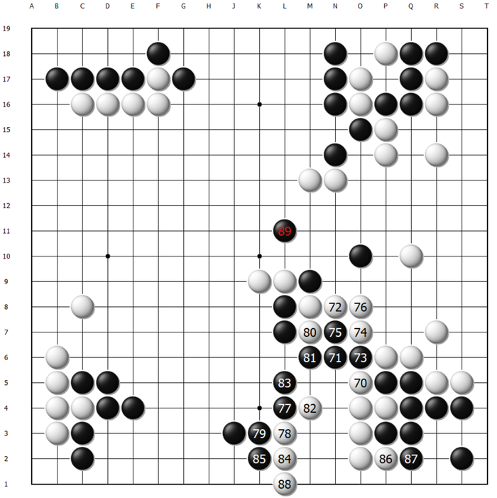 至于69和71的组合拳,可以说是这盘棋失利根本原因之一。这里申真谞的飞刺大概是忽略了对手反击的可能性,尽管看上去被分断后白棋十分凶险,但局部恰好能搭出两个眼位。