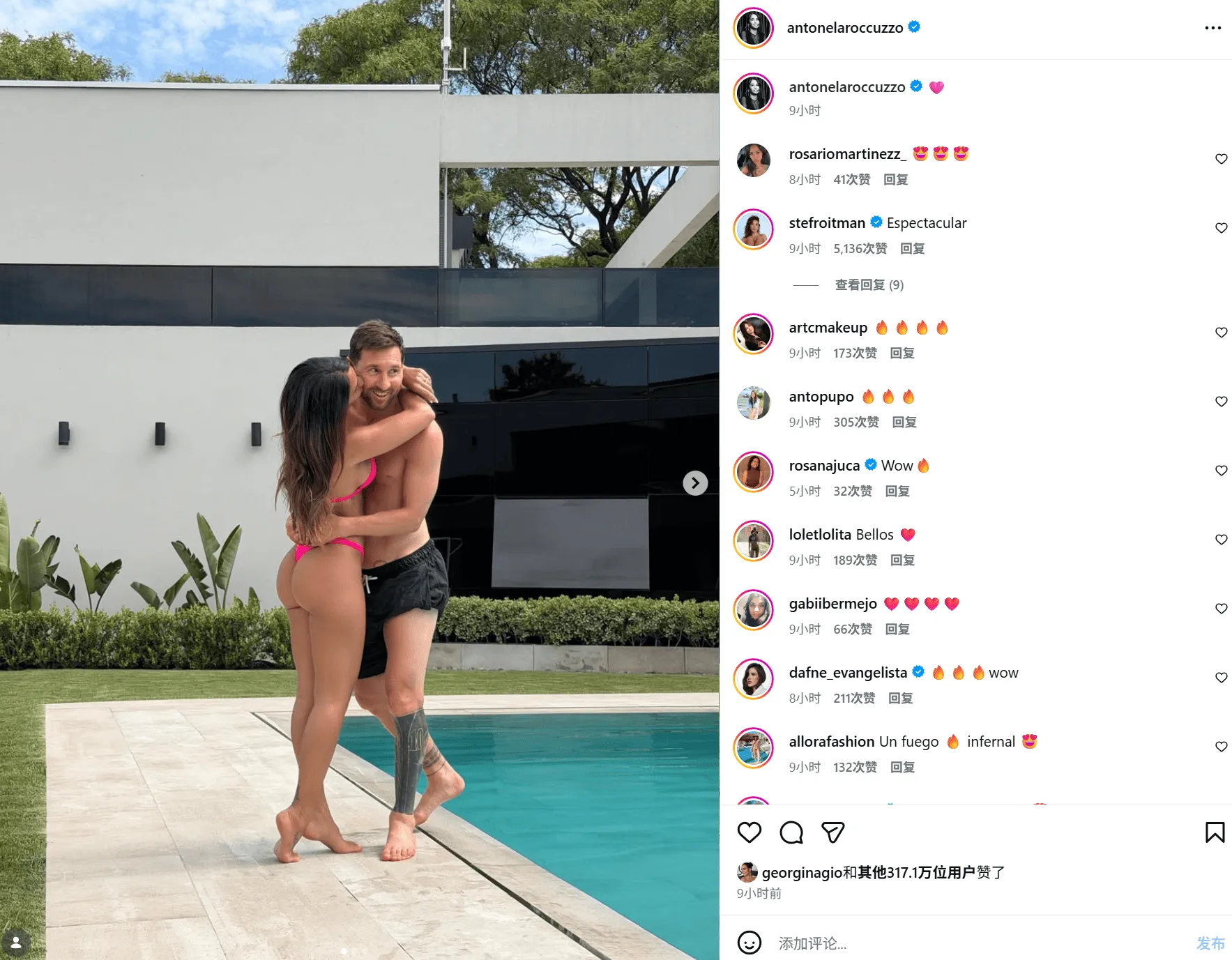 照片中,安东内拉身穿比基尼套装,在泳池边亲昵地搂着梅西,并亲吻了他,夫妻俩很是恩爱。