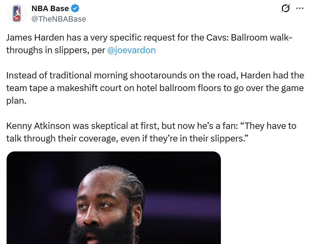 赛前美记Joe Vardon甚至曝出哈登在球队客场征战期间向骑士队提出了一项非常具体的要求:在酒店宴会厅里穿着拖鞋进行战术演练。